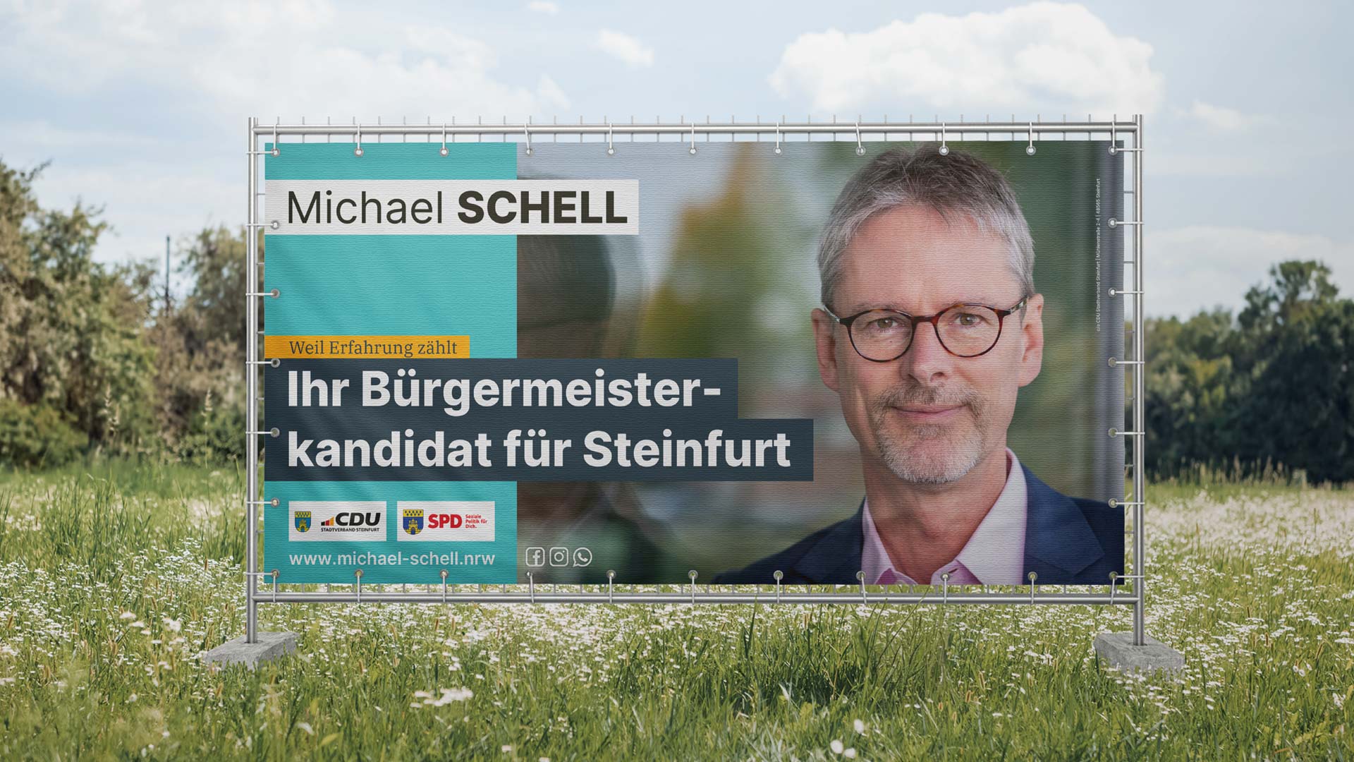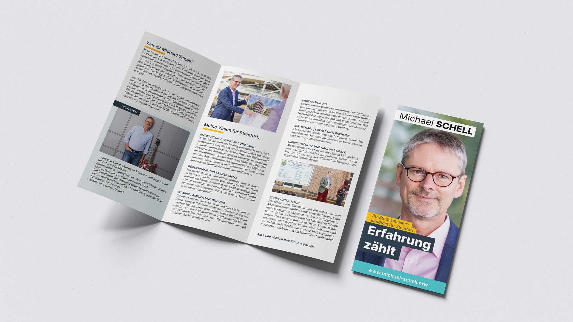 Für Michael Schell haben wir die grafische Umsetzung und das Gestaltungskonzept seines Bürgermeisterwahlkampfes übernommen. Ziel war ein moderner, klarer Auftritt, der Persönlichkeit und Themen ansprechend vermittelt und für hohe Wiedererkennung sorgt. Unsere Arbeit konzentrierte sich auf die visuelle Gestaltung der Kampagne – von Print- und Außenwerbung über Layouts bis zur einheitlichen optischen Linie. Dabei war uns wichtig, die Werte und Haltung des Kandidaten gestalterisch zu transportieren, ohne den inhaltlichen Kurs des Wahlkampfs selbst zu bestimmen. Das Ergebnis war ein professioneller und aufmerksamkeitsstarker Auftritt, der Michael Schell in der Öffentlichkeit klar positionierte. Die einheitliche Gestaltung schuf Wiedererkennung und vermittelte Glaubwürdigkeit – wichtige Faktoren für eine gelungene Wahlkommunikation. Auch ohne strategische Begleitung zeigt dieses Projekt, wie durchdachtes Design die Wahrnehmung eines Kandidaten sichtbar prägen kann.